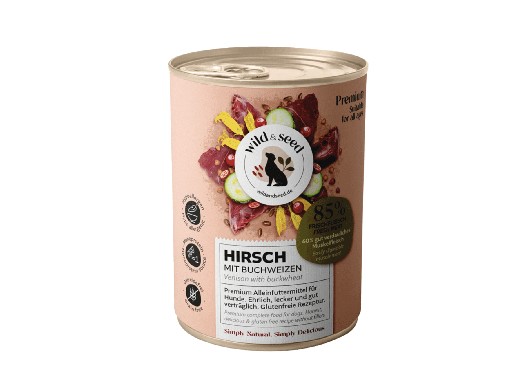 Verwöhne deinen Hund mit einer exklusiven und nachhaltigen Mahlzeit: Das Wild&Seed Genuss-Menü „Hirsch mit Buchweizen“ bietet alles was unsere Hunde sich nur im Napf wünschen können. Diese Rezeptur vereint hochwertiges Wildfleisch mit gesunden, getreidefreien Zutaten und ist ideal für sensible Hunde und Allergiker.